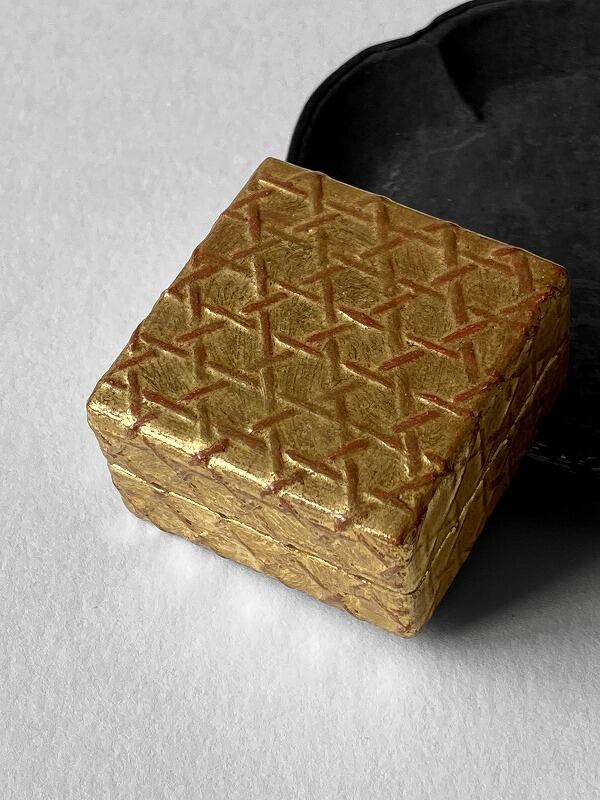 ヨーロッパ古典技法で純金箔を貼り、パスティリアで六つ目編みの模様をを装飾しました。アンティーク加工を施し、純金箔と下地の赤色が凹凸を表現しています。