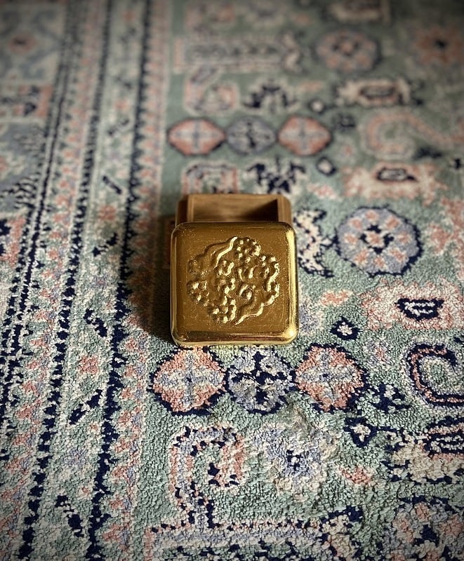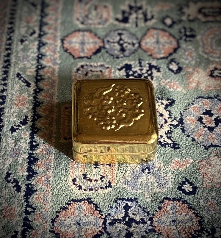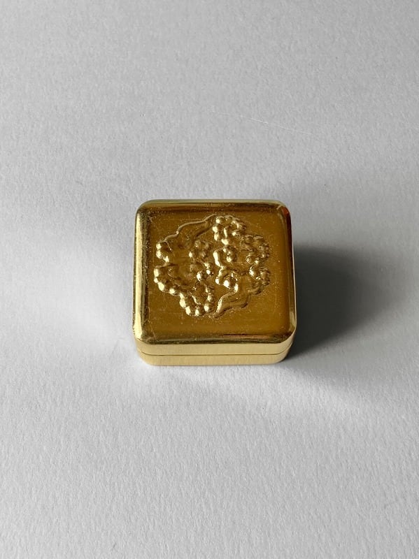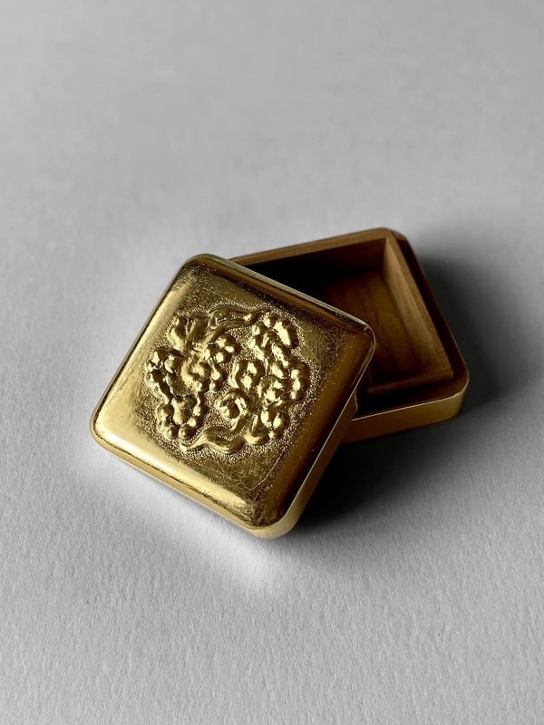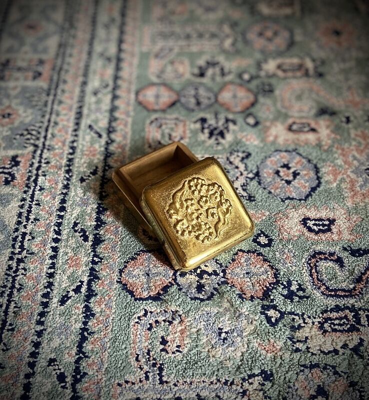 桐木地小箱にボローニャ石膏、パスティリア(石膏盛り上げ)と点打ちで模様入れ、赤色ボーロに純金箔水押し、メノウ磨き。